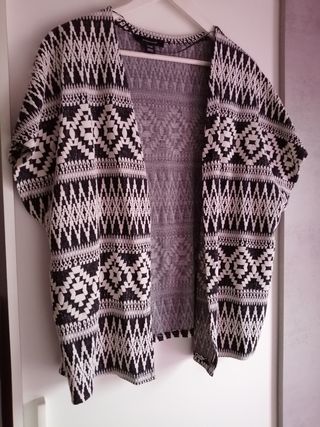 Cárdigan sin mangas de corte amplio, en tonos negro y blanco. Es como una 44 pero abarca varias tallas por su corte abierto. En perfecto estado.