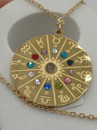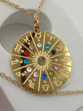 Original colgante de la rueda zodiacal con cadena, de Oro Gold Filled con circonitas. La rueda zodiacal simboliza en astrología la evolución espiritual, está compuesta por 12 signos, 12 casas y 10 planetas, cada casa se rige por su signo correspondiente. Esta sirve para dividir el horóscopo de los 12 signos en 4 partes, cada una abarca 3 signos y representa, según las casas que incluye, determinados aspectos de la vida. Con él, recibirás unos regalos, como con todos y cada uno de los articulos de mi armario. Si haces un lote con dos o más artículos, te haré un precio especial. Cualquier duda por privado. Gracias.