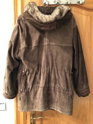 Parka de napa y cuero con capucha con pelo natural y forro acolchado. La capucha se puede quitar o poner por medio de notones. Para cerrar la parca se puede hacer tanto con botones como con cremallera. Jareta con un cordon en la cadera para poder ajustarla. Abarca mas o menos de talla 38 a 42 ya que es amplia y tiene manga japonesa. Es de color verde caqui oscuro y los detalles de bolsillos y cuello de cuero marron. Muy calentita en dias de invierno y ademas la capucha se puede ajistar al cuello frunciendola con el cordon.