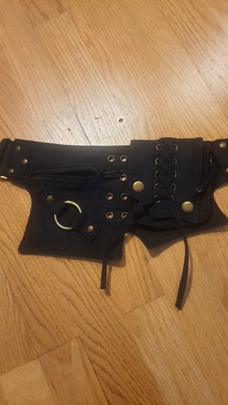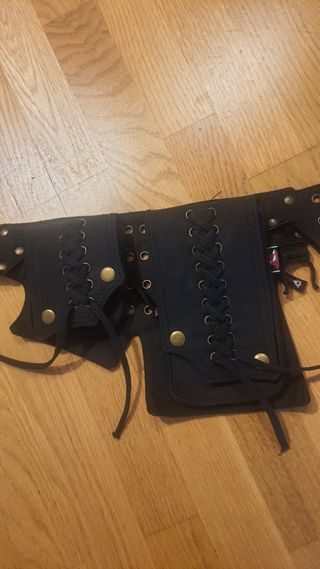 Riñonera negra con varios bolsillos. Cabe un móvil (mi samsung note10lite cabe perfecto). Esta sin estrenar. Tiene muchos agujeros para abarcar cualquier tamaño de cadera.