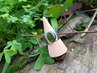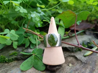 Anillo con un diseño único que incorpora musgo natural encapsulado. - El musgo está preservado dentro de una resina transparente. - El anillo es ajustable para adaptarse a diferentes tamaños de dedo. - El bisel del anillo tiene un diseño ornamental detallado. - Acero inoxidable plateado.