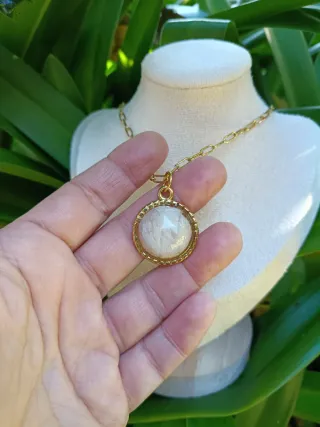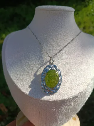 Collar con un colgante de musgo natural encapsulado. Una pieza única que combina la belleza de la naturaleza con un diseño elegante. - Colgante ovalado con musgo natural. - Marco de acero inoxidable plateado con diseño trenzado. - Cadena de acero inoxidable plateado.