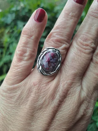 Anillo con un diseño único que incorpora pétalos de buganvilla e hibisco. - Acero inoxidable plateado. - Diseño ovalado con detalles trenzados. - Ajustable para adaptarse a diferentes tamaños.