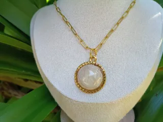 Collar con un diseño de pétalo de orquídea encapsulado. - Colgante con forma ovalada. - Marco dorado con textura trenzada de acero inoxidable.