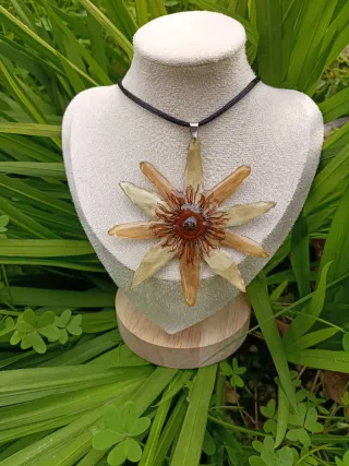 Collar con un colgante de flor de la pasión natural (Pasiflora) encapsulada. - Diseño único con flor secada en arena de sílice. - Cordón negro de seda para colgar con engarces plateados de acero inoxidable.