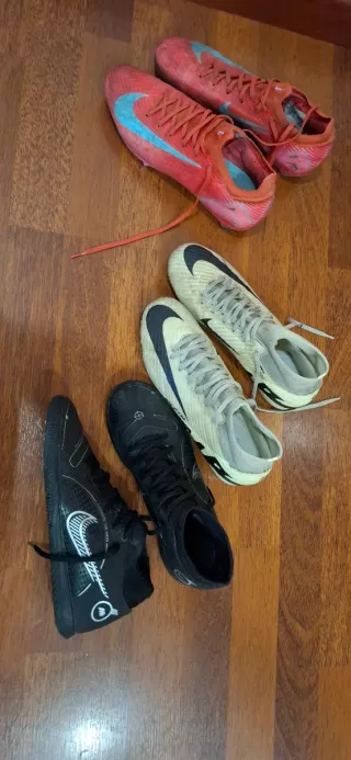 Botas de fútbol Nike Mercurial en color rojo y azul. Diseñadas para un rendimiento óptimo en el campo. - Parte superior con diseño dinámico. - Suela con tacos para tracción. - Cierre con cordones. Las negras son nuevas Las otras se han utilizado varias veces El precio es cada una
