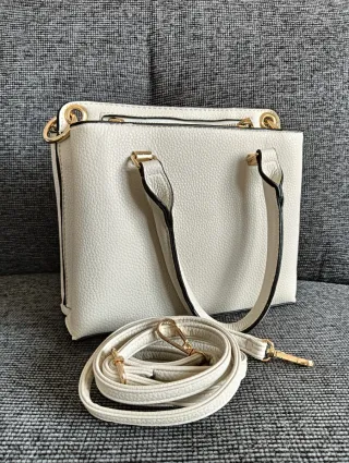 Bolso de mano en color blanco con detalles dorados. - Asa corta para llevar en la mano. - Correa larga ajustable para llevar cruzado. - Tres cierres de cremallera. - Departamentos en el interior. - Cremallera interior. Bolso elegante y resistente. Sin usar!!