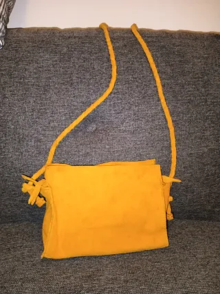 Bolso de mano o bandolera de Zara en color mostaza anaranjado. - Material tipo ante. - Cierre con solapa. - Adorno de flecos en los laterales. - Correa trenzada ajustable. Muy bonita! Usado una vez!! 5€