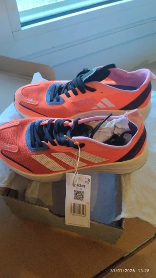 Zapatillas deportivas Adidas en llamativos tonos naranja y negro. Perfectas para correr o para el día a día. - Diseño deportivo. - Cierre con cordones negros. - Detalle de las tres bandas Adidas en blanco. -Es un 39 pero pequeño, sería como un 38 -Adidas Bombai