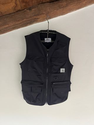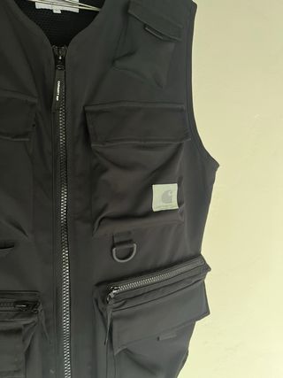 Chaleco de estilo utilitario con múltiples bolsillos. Carhartt Work in Progress. Talla L Modelo Elmwood Vest. - Cierre frontal con cremallera. - Bolsillos frontales con solapa y cremallera. - Bolsillo con logo en el pecho. - Casi sin uso, muy buen estado