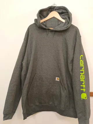 Sudadera Carhartt de color gris, nueva y sin etiqueta. Presenta un diseño moderno y cómodo. - Logo de la marca en la manga. - Bolsillo frontal tipo canguro. - Capucha ajustable con cordones.