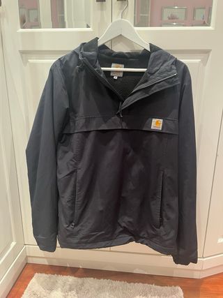 Chubasquero Carhartt de color azul marino. - Diseño tipo anorak. - Capucha ajustable. - Bolsillo canguro delantero. - Cierre de cremallera parcial en el cuello. - Descuento por compra de otro articulo Prefiero venta en mano