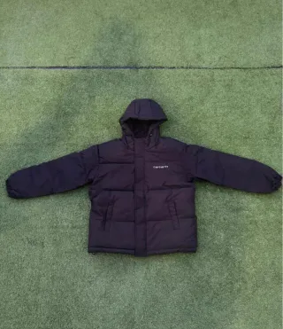 Abrigo Carhartt de color negro, talla M. Diseño acolchado y moderno. - Capucha integrada. - Cierre de cremallera frontal. - Bolsillos laterales con solapa. - Puños ajustables.