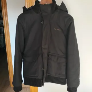 Abrigo Carhartt de color negro, con capucha y forro interior. - Cierre de cremallera y botones. - Bolsillos frontales con solapa. Esta en buen estado usado 2 anos Lo compre en 2023 Me costo nuevo 250€ ( en ese momento ) Vendo en 110€ No esta ni roto ni en mal estado simplemente usado .