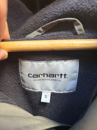 Abrigo tipo parka de la marca Carhartt. - Capucha con forro interior. - Cierre frontal con cremallera y botones. - Bolsillos frontales con solapa y botón. - Puños ajustables. - tiene un descosido como se ve en las fotos y lo de subir la cremallera se sube muy bien así pero le falta ese detalle