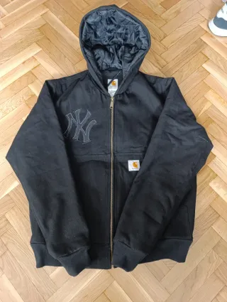 Chaqueta Carhartt negra con diseño de los Yankees. - Logo de los Yankees bordado en el pecho. - Cierre de cremallera frontal. - Capucha. - Bolsillos laterales. Rework