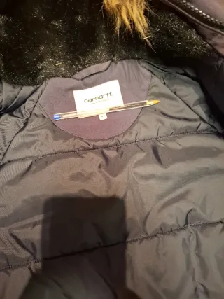 Abrigo Carhartt de color negro, ideal para el frío. - Capucha con cordones ajustables. - Cierre de cremallera y botones a presión. - Dos bolsillos frontales - Bolsillos laterales a la altura del pecho. - Forro interior de pelo sintético en la capucha. - Bolsillo interior con velcro Está usado pero en buen estado, sigue siendo funcional. Está un poco dañado en la parte de la cremallera pero cierra bien. Es talla M de mujer pero unisex, yo soy una persona grande y no me queda ajustado