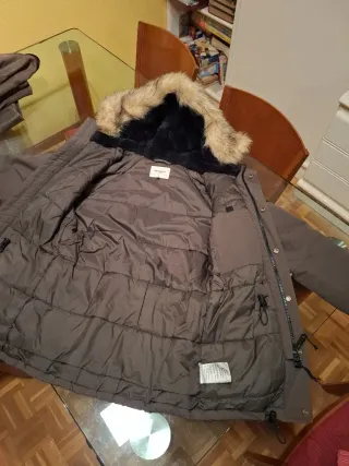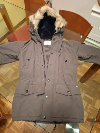 Abrigo Carhartt de color verde con capucha. - Cierre de cremallera y botones en perfecto estado. - Bolsillos frontales con solapa. - Cordón ajustable en la cintura. - Forro interior de pelo sintético.