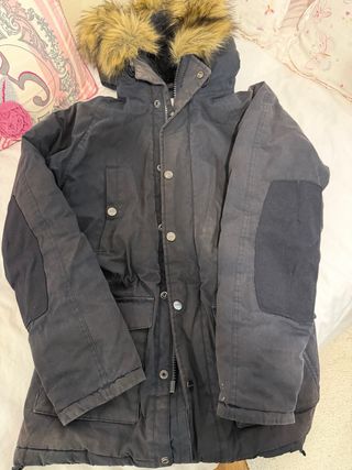 Abrigo negro con capucha talla L, negro, tela impermeable. Bolsillo interior. Sistema de cierre con cremallera y velcro. Tiene un parche pequeño (unos 4cm), y puño desgastado, el puño puede cambiarse en tiendas de costura o mercería. Muy calentito y aislante de frío y viento.