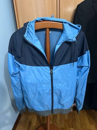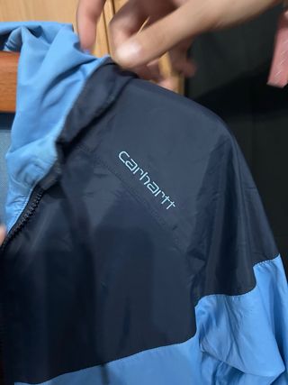Cazadora Carhartt de talla S en color azul marino. - Diseño moderno y funcional. - Capucha integrada. - Cierre con cremallera y cordones ajustables.