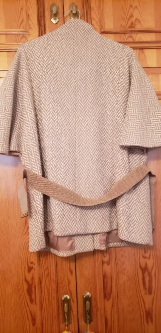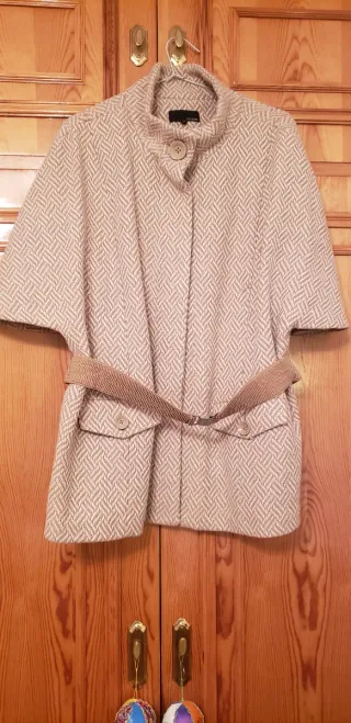 Abrigo/capa con medias mangas beige jaspeado con cinturón elástico y bolsillos. NUNCA USADO Talla 52. Medidas: De sisa a sisa 65cm Largo 73cm