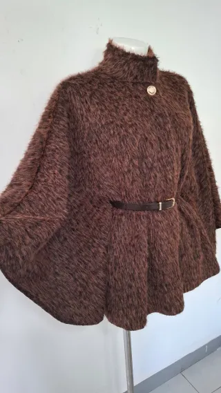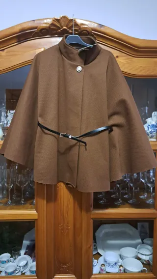 Elegante capa de abrigo en color marrón. Perfecta para añadir un toque sofisticado a cualquier atuendo. - Diseño tipo capa. - Cinturón negro a juego incluido. - Cuello alto.