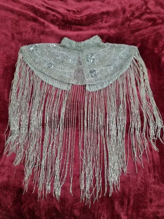 Artesana elegante capa para cubrir los hombros de mi viaje a la India, adornada con abalorios plateados y flecos. - Diseño con cuello alto. - Adornos de abalorios y lentejuelas. - Flecos largos y delicados. - Cierre de enganche. La apertura se puede poner tanto delante como detrás. Es espectacular.