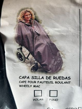 Capa polar para silla de ruedas – Impermeable y muy abrigada Vendo capa polar para silla de ruedas, ideal para invierno y días fríos. Diseñada para proteger totalmente del frío, viento y lluvia ligera. - Modelo POLAR (interior térmico, muy calentito) - Cubre completamente piernas y cuerpo - Fácil de poner y quitar - Compatible con la mayoría de sillas de ruedas - Ideal para paseos y uso diario en invierno En muy buen estado, limpia y lista para usar.
