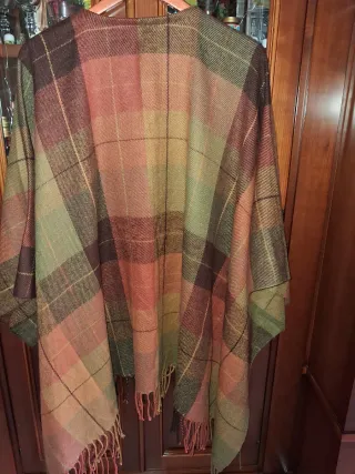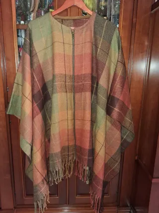Capa de abrigo con un diseño de cuadros en tonos otoñales. Perfecta para añadir un toque de estilo a cualquier conjunto. Medidas: 140 cms. ancho Largo: 80 cms. - Tejido de lana. - Cierre de cremallera frontal. - Diseño con flecos en el bajo. Tejido suave y calentito A estrenar