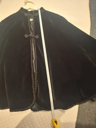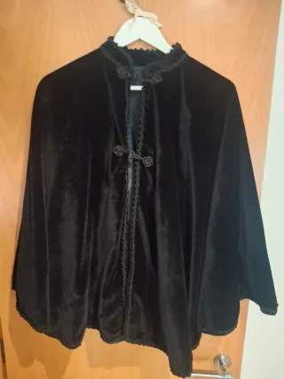 Elegante capa de terciopelo negro. - Material: Terciopelo. - Cierre con botones y detalles de encaje. - Cuello alto con adornos. - Diseño abierto.