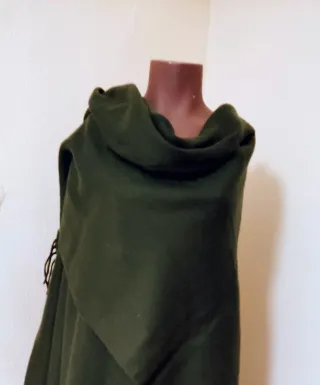 Preciosa capa en color verde oliva, ideal para añadir un toque de estilo. - Diseño amplio y envolvente. - Acabado con flecos en los bordes. - Ancho, de punta a punta 147cm - Largo, desde el hombro hacia los pies, 91cm.
