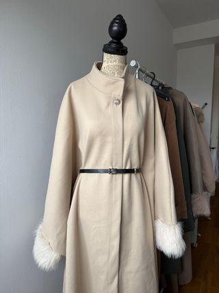 Elegante capa abrigo en color beige, con un diseño moderno y detalles de pelo en los puños. - Diseño tipo capa. - Puños con pelo sintético blanco. - Cinturón negro a juego.