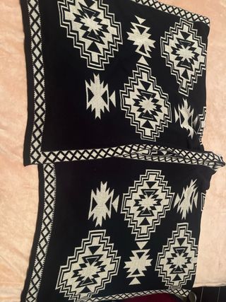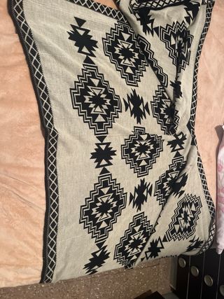 Chaqueta tipo capa con un diseño geométrico llamativo. Es una prenda versátil y cómoda. - Diseño con motivos geométricos en blanco y negro. - Borde decorativo con patrón de rombos.