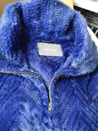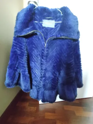 Elegante abrigo de pelo en un vibrante color azul. Diseñado con un patrón de espiga que añade textura y sofisticación. - Cierre de cremallera frontal. - Cuello alto con acabado de pelo. - Material suave y cálido.