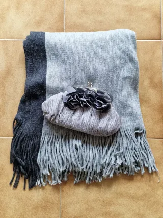 Conjunto elegante de capa y bolso de fiesta. - Capa de tejido suave con detalles de flecos. - Bolso de mano con adornos de volantes y cierre de clip.