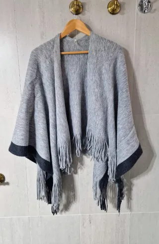 Precioso poncho capa de paño en color gris. Ideal para añadir un toque de estilo. - Adornos de pelo sintético multicolor en la capucha. - Detalle de borlas colgantes. Talla única. Es suave y ligero. Le queda bien a todas las tallas ya que va sólo metido por la cabeza. NO REBAJO!!!