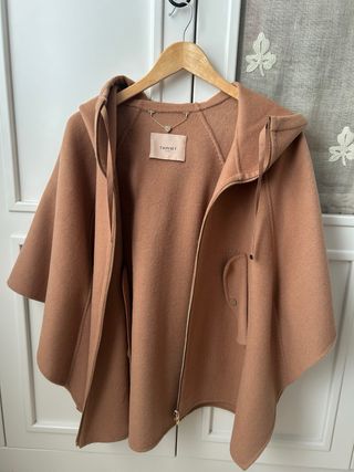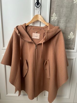 Elegante capa de paño en color camel de la marca Twinset, perfecta para añadir un toque especial a tu look. - Diseño con capucha. - Cierre de cremallera frontal. - Bolsillos laterales con solapa. Mínimo uso (3-4 ocasiones) y con gran cuidado.