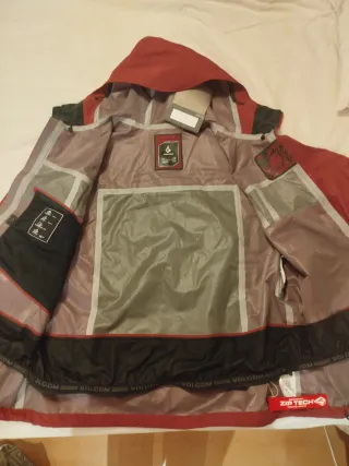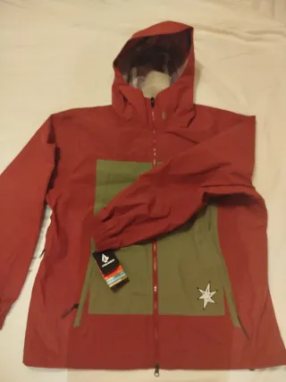 Cazadora snow de gama alta, tecnología 3 capas, colección Arthur Longo de Volcom Corte holgado e interfaz Zip Tech Costuras selladas Corte baggy Ventilaciones con cremallera y forro de malla fina. Puños elásticos Anilla especial para ticket Silbato en cremallera Precio original 300€