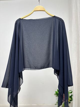 Chal invitada gasa azul marino de fiesta, tiene abertura para meter la cabeza, puedes ponerlo en varias formas según qué te guste más, perfecto para cualquier eventos, con medida 148cm de largo y 88cm de ancho, nuevo nunca se ha usado #tiestas #chalesfemme #bodasbautizoscomuniones #gasa #chal