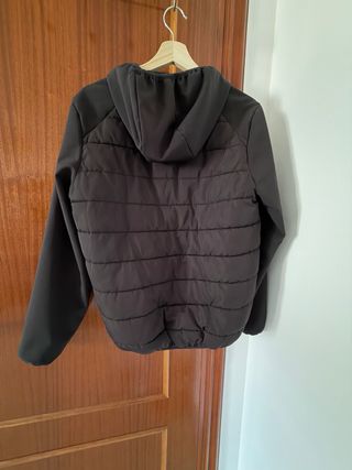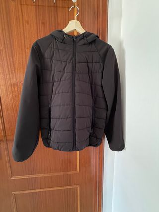 Abrigo de Decathlon con un diseño moderno y bicolor. - Mangas de color gris oscuro. - Cuerpo principal en negro y gris. - Capucha integrada. - Cremallera frontal.