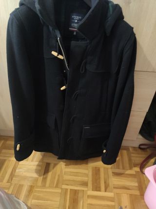 Abrigo negro de paño, modelo clásico con botones y bolsillos delanteros. Talla XL. Marca Lefties. En perfecto estado apenas usado aunque no se aprecia en las fotos. Tejido perfecto sin pelotillas ni roces, ver sin compromiso. Recoger zona Embajadores
