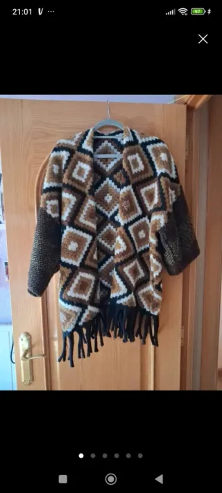 Prenda de abrigo de lana en color beige, con un diseño moderno y versátil. Da mucha talla, hasta la XL - Tejido de punto grueso. - Cuello alto con cremallera. - Aberturas laterales. - Da mucha talla - Mide del cuello hasta el final 68 cm Se puede entregar en Alcorcón, Villaviciosa, Brunete, Navalcarnero, Xanadu, Sevilla La Nueva o en la parada de tren San Fernando.