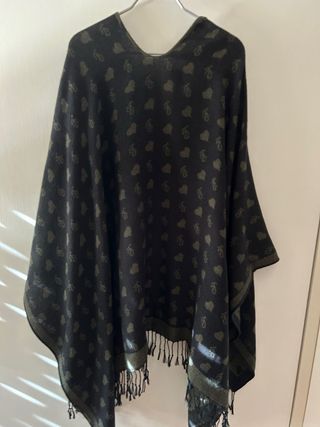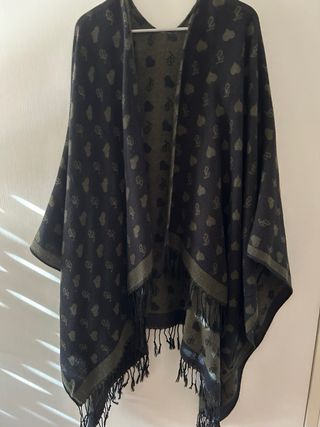 Elegante poncho con un bonito estampado de corazones y detalles en los bordes. Perfecto para añadir un toque especial a tu atuendo. - Diseño con estampado integral de corazones. - Acabado con flecos en el bajo. - Borde decorativo en contraste. - Reversible
