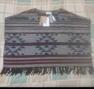 Poncho de punto con un diseño étnico y flecos en el bajo. Ideal para añadir un toque especial a cualquier conjunto. - Diseño de rayas y grecas. - Acabado con flecos. - Tejido suave y cálido. poliéster, acrílico, viscosa,lana, poliamida. en los laterales cierre con corchetes. precio en la etiqueta 25.99 euros.