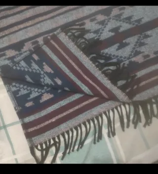 Poncho con un diseño étnico y moderno. Ideal para añadir un toque especial a tu look. talla S/M con un 15%lana - Diseño con estampado geométrico en tonos burdeos, ocre y blanco. - Acabado con flecos largos en el bajo. - Tejido suave y confortable.