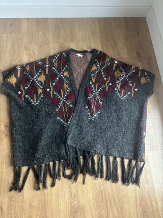 Poncho de invierno. Punto. Super calentito. Algo más largo por detrás que por delante. Flecos en las mangas. Cuello alto. Muy buen estado