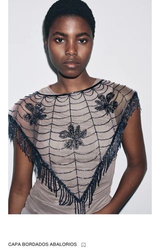 Elegante capa con un diseño de telaraña bordada y adornada con abalorios. Los detalles de abalorios crean un efecto brillante y sofisticado. - Diseño de telaraña. - Adornos de abalorios. - Flecos en el borde inferior.