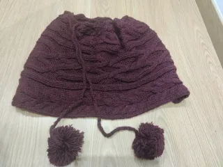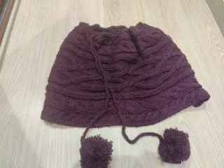 Prenda de punto en color corinto oscuro, ideal para abrigar el cuello. - Diseño tejido con trenzas. - Cordón ajustable con pompones. - Tejido suave y cálido.
