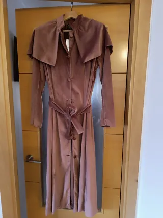 Elegante abrigo largo de color rosa, con cinturón y cuello tipo capa. Conserva las etiquetas originales. - Cierre de botones. - Tejido de terciopelo. - Diseño largo y entallado.