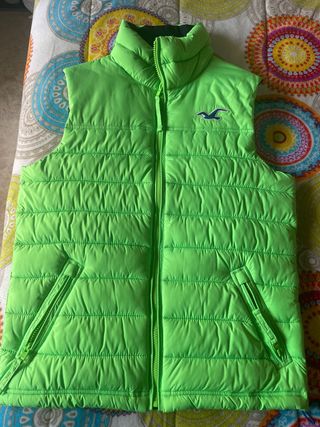 Chaleco acolchado de la marca Hollister en un llamativo color verde. Es una prenda ligera y cómoda, ideal para añadir una capa extra de abrigo. - Diseño sin mangas. - Cierre de cremallera frontal. - Bolsillos laterales con cremallera.